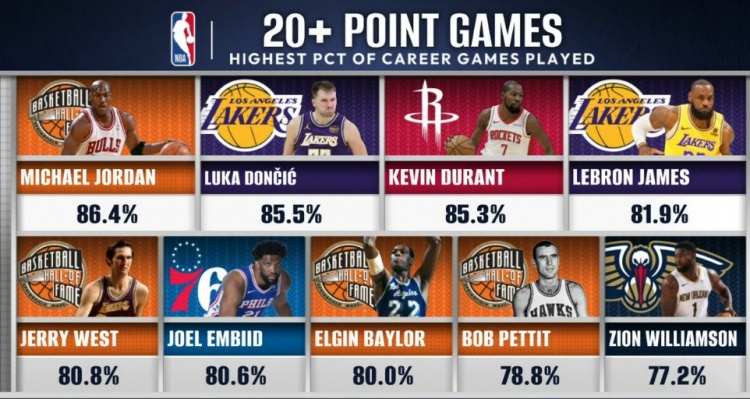 历史20+场数占比:乔丹86.4%第1 东契奇2KD3詹姆斯4恩比德6锡安9